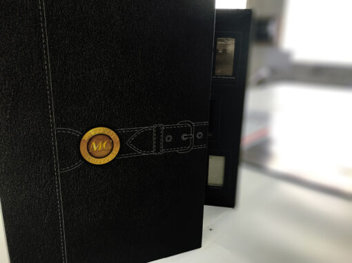 Calendrier bancaire contrecollé rembordé, pelliculage mat, brillant vernis sélectif, échantillonnier.